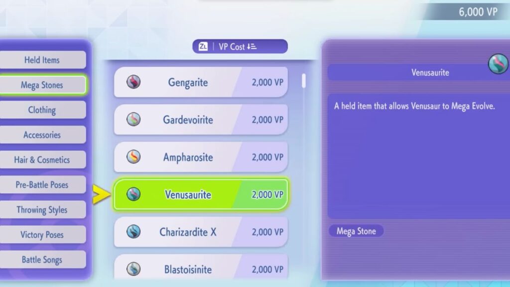 • Mega Stones: Cost 2,000 VP each. You need these to Mega Evolve specific Pokemon during battles. Each Pokemon requires its own unique Mega Stone.