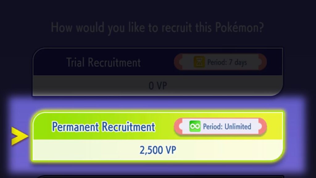 • Permanent recruitment (2,500 VP): Spend VP to keep a recruited Pokemon forever. This is essential for building a stable competitive team since temporary Pokemon disappear after a week.